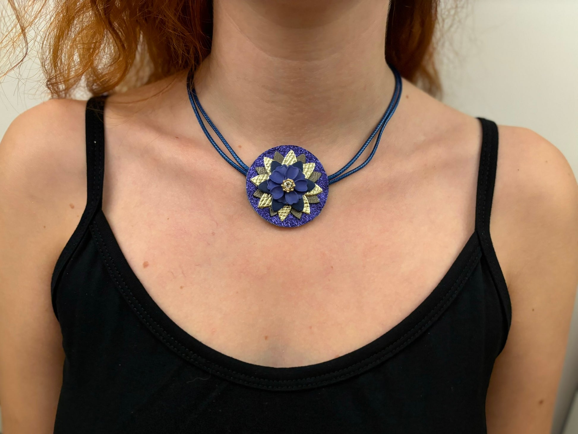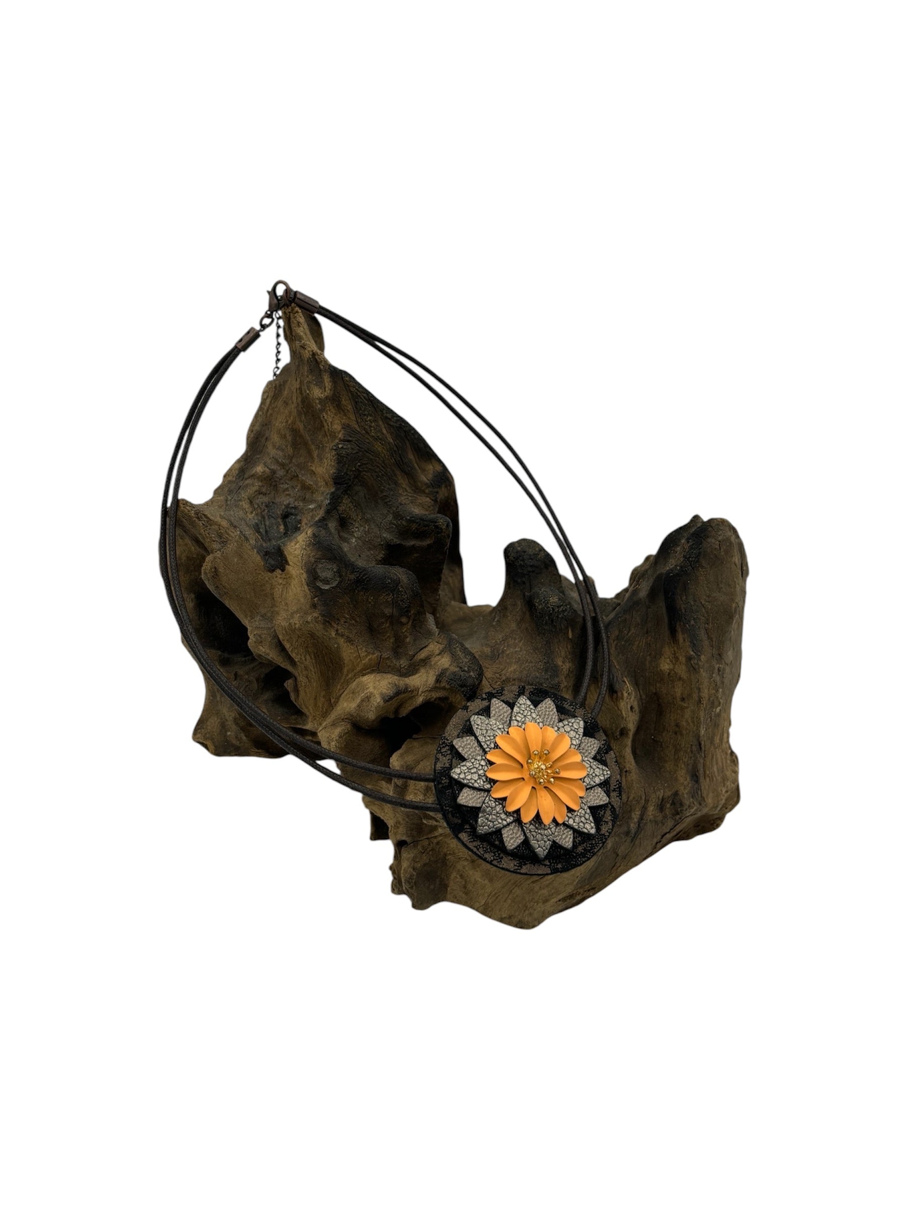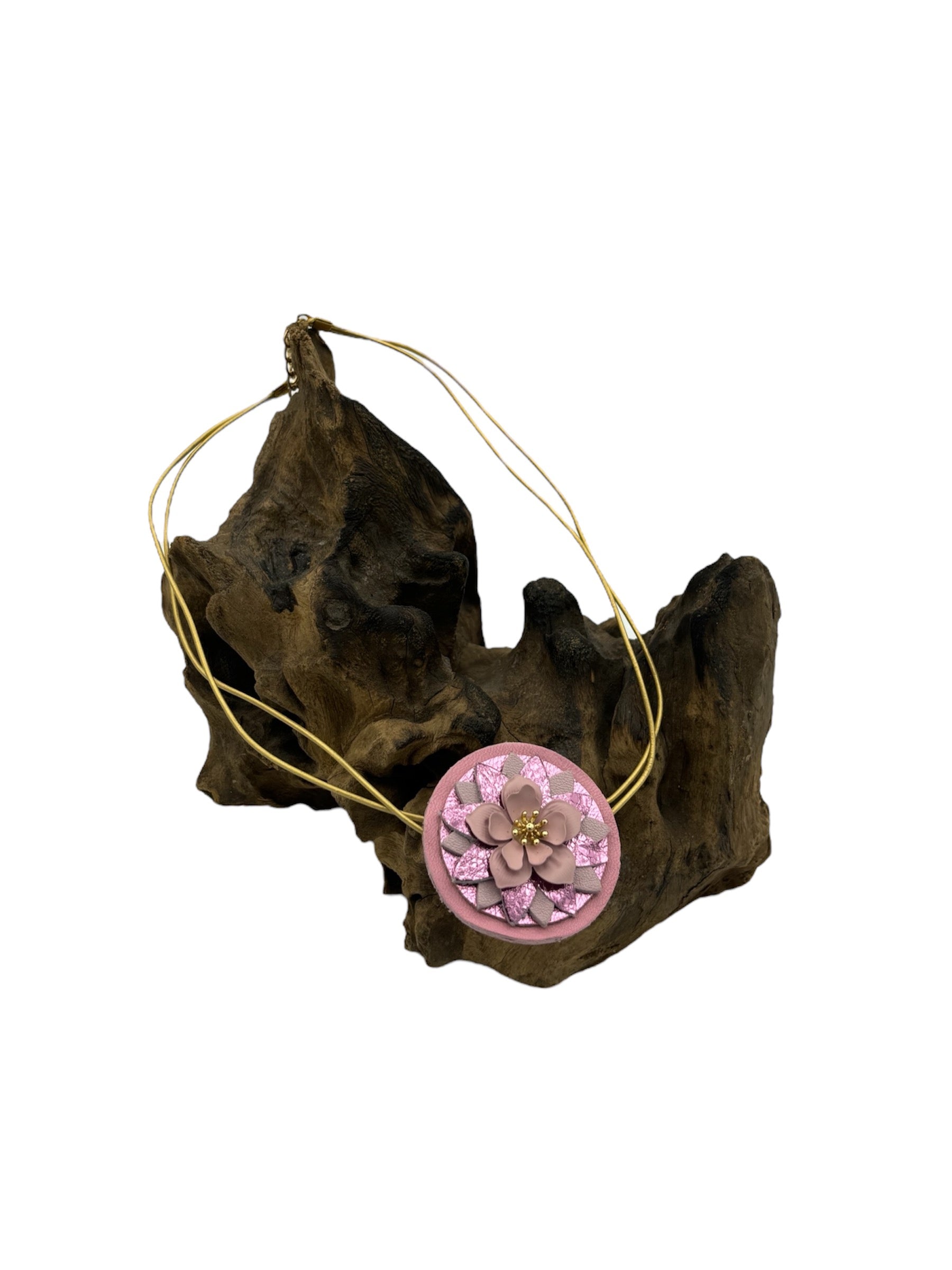 Fresia è facilmente indossabile grazie alla chiusura con moschettone, una collana a girocollo realizzata con pelli luminose e un fiore smaltato al centro.
