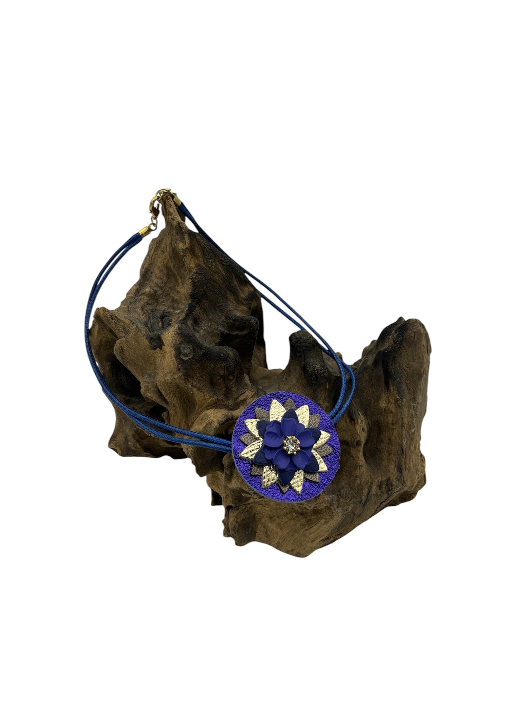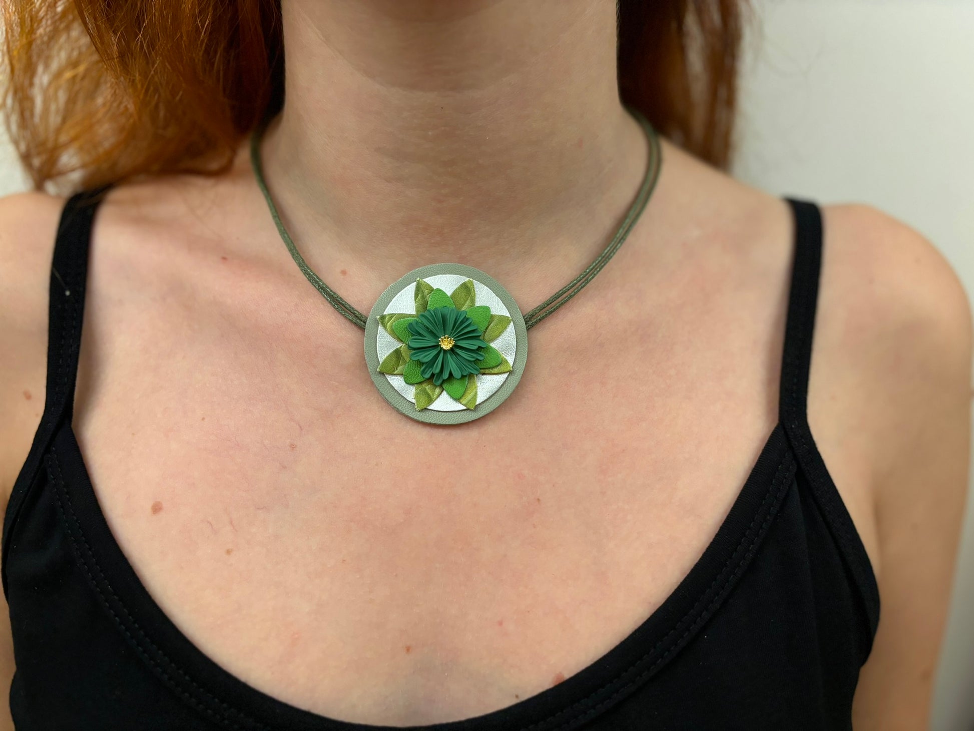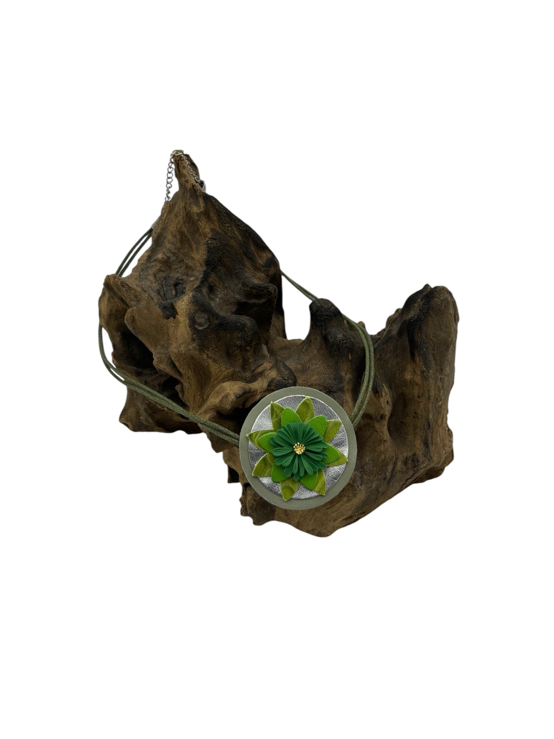 Fresia è facilmente indossabile grazie alla chiusura con moschettone, una collana a girocollo realizzata con pelli luminose e un fiore smaltato al centro.
