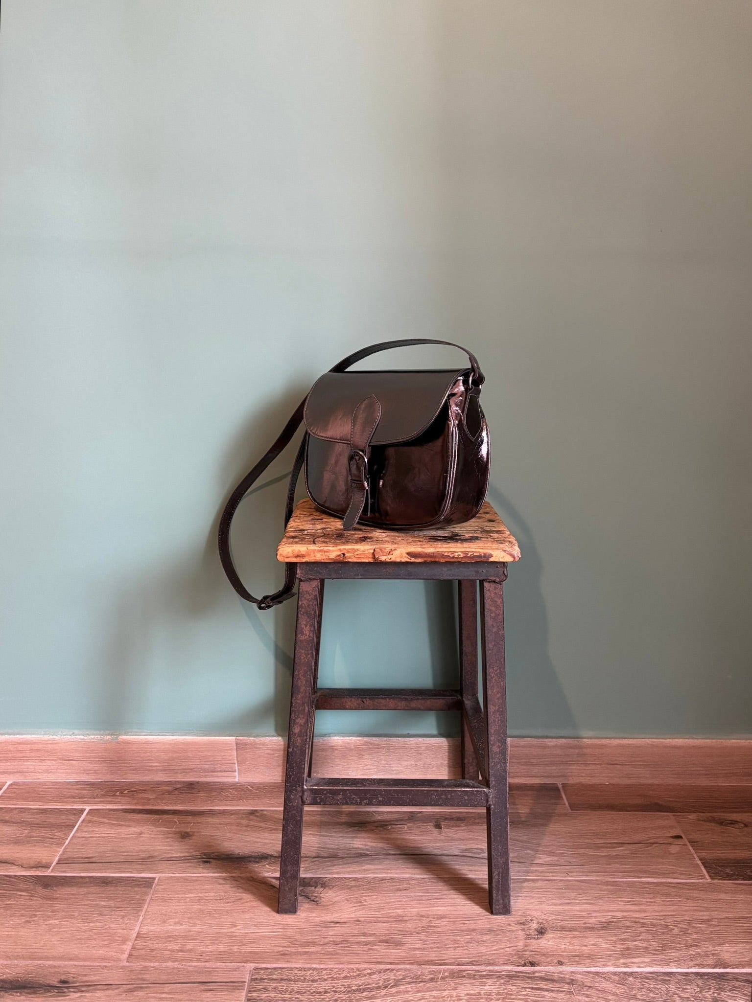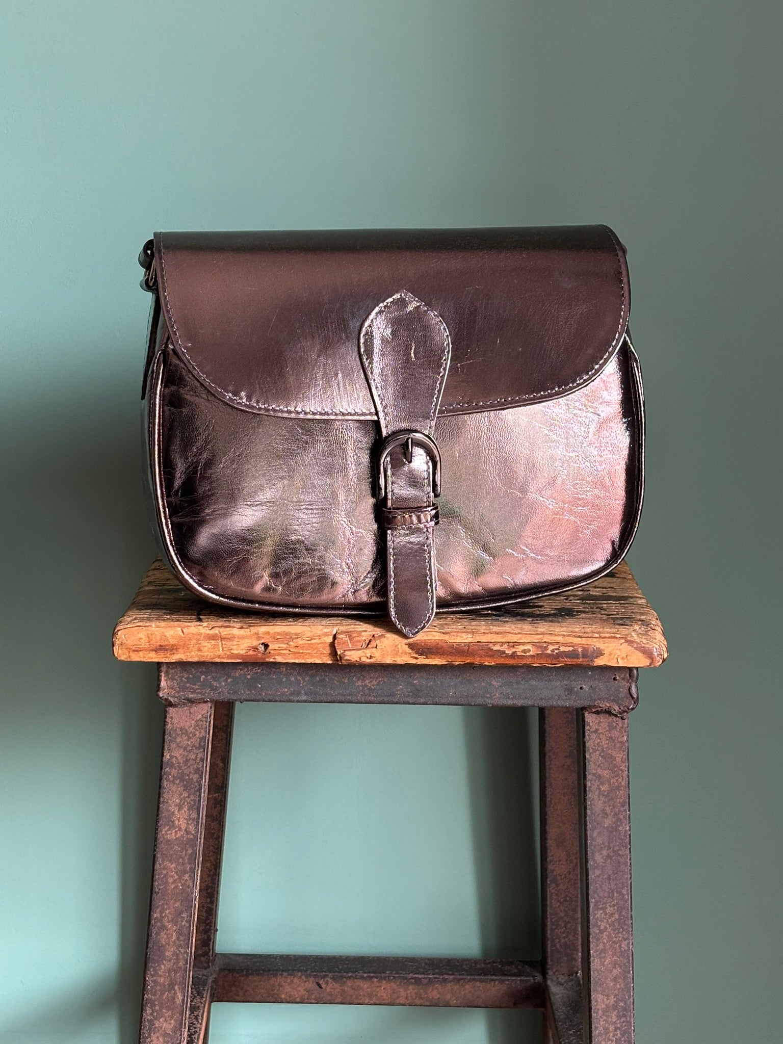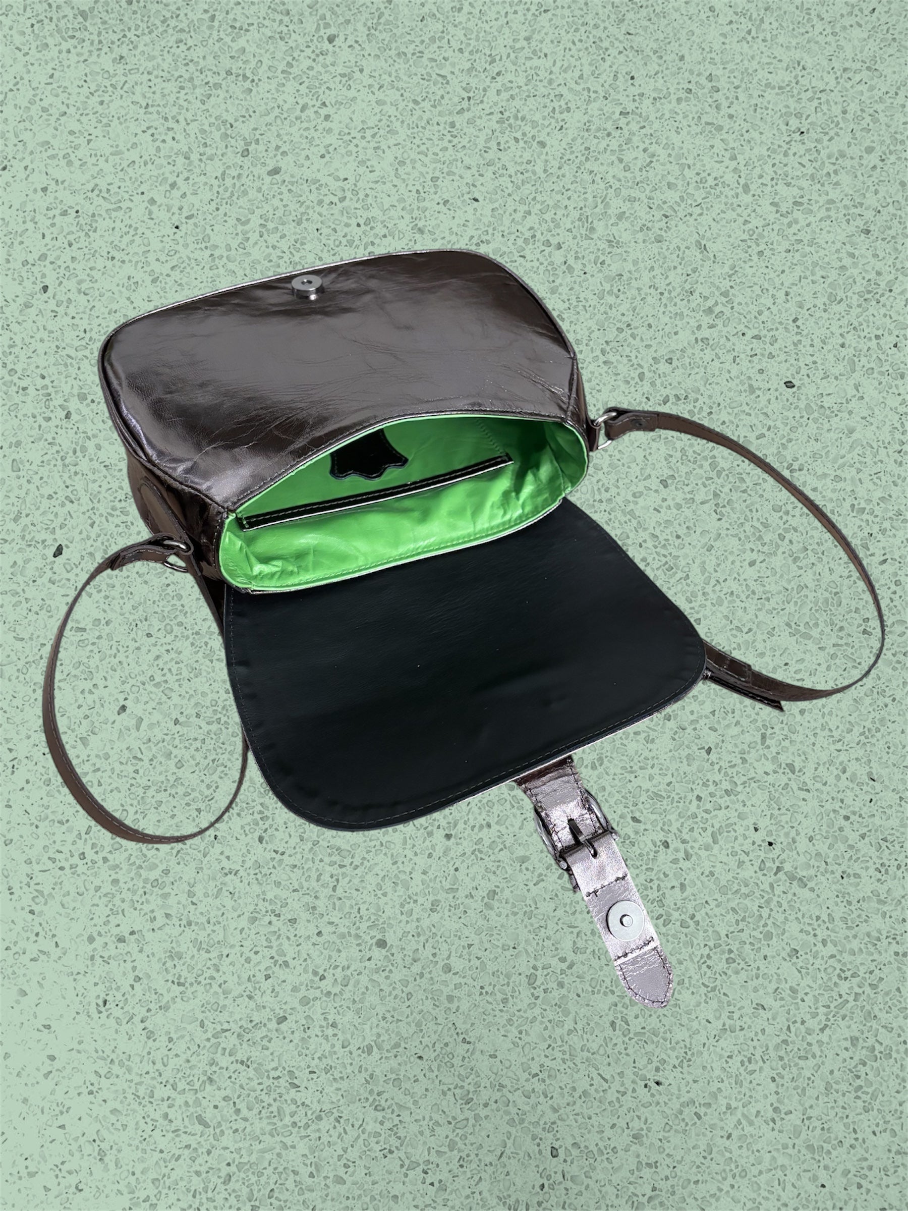 Una borsa a tracolla, regolabile, in vera pelle, foderata con taschino interno, si chiude con un pratico magnete nascosto sotto la fibbia.